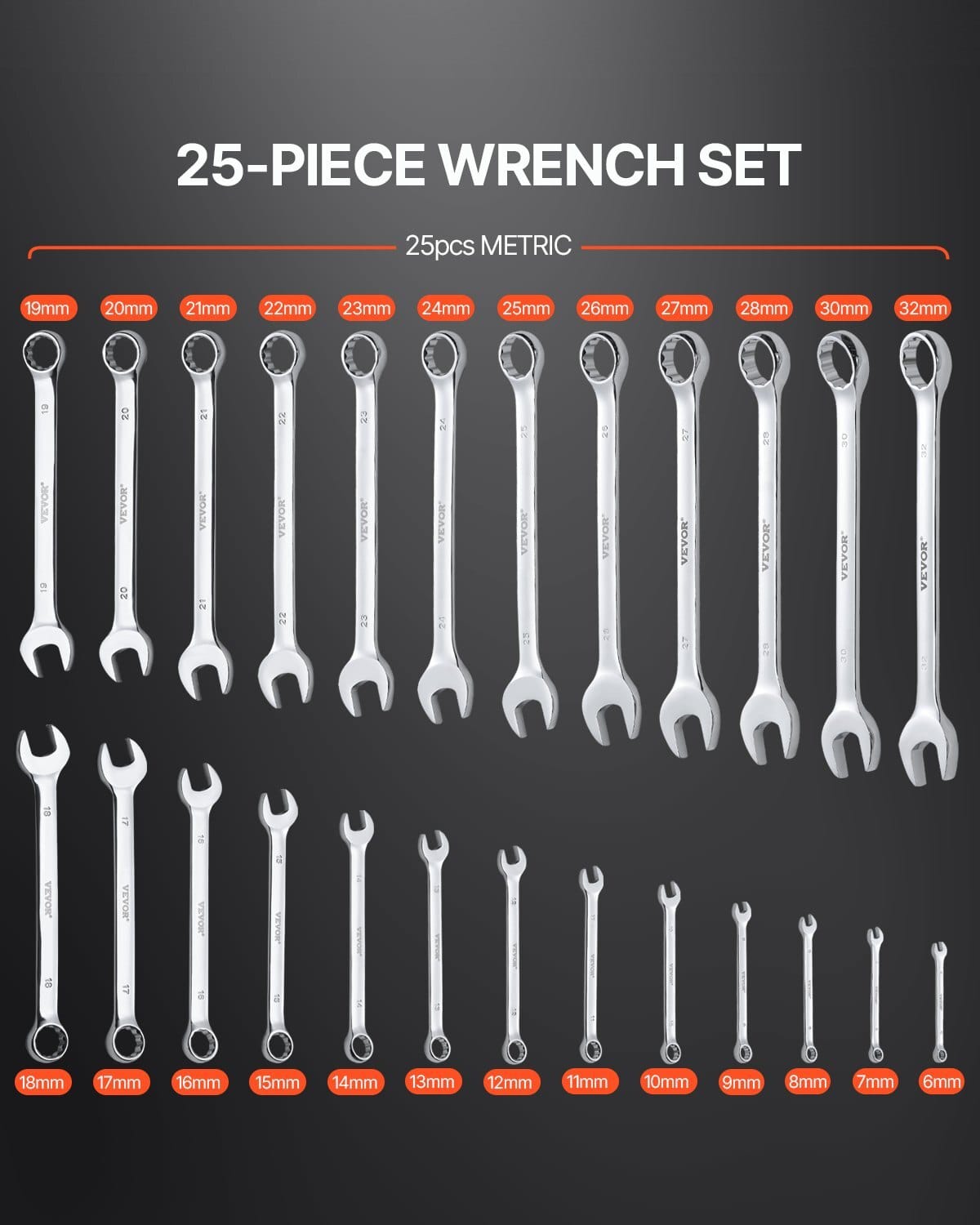 VEVOR Combination Wrench Set, 25-Piece Open End Wrench Set withRoll-up Pouch, Carbon Steel Wrench Set Metric 6 mm to 32 mm, Idealfor General Household, Garage, Workshop, Auto Repairs,Emergency