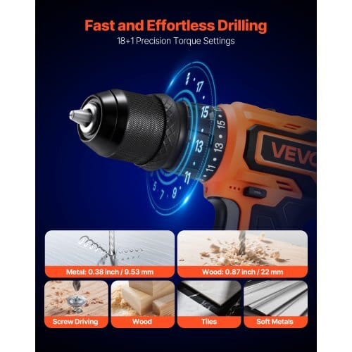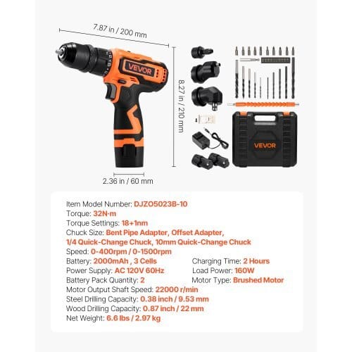 Speed: Dual-Speed, 0-400rpm / 0-1500rpm,Torque: 32N·m,Speed 2Power: 35W,Steel Drilling Capacity: 0.38 inch / 9.53 mm,ProductDimensions: 7.87 x 2.36 x 8.27 inch / 200 x 60 x 210 mm,Speed 1Power: 36W,Charging Time: 2 Hours,Power Supply: AC 120V 60Hz,TorqueSettings: 18+1nm,Wood Drilling Capacity: 0.87 inch / 22 mm,BatteryPack Quantity: 2,Operating Voltage: 8.1-12.6V,Battery: 2000mAh, 3Cells,Item Model Number: DJZO5023B-10,Load Power: 160W,Net Weight:6.6 lbs / 2.97 kg,Main Material: PA6+GF30+TPE+Rubber