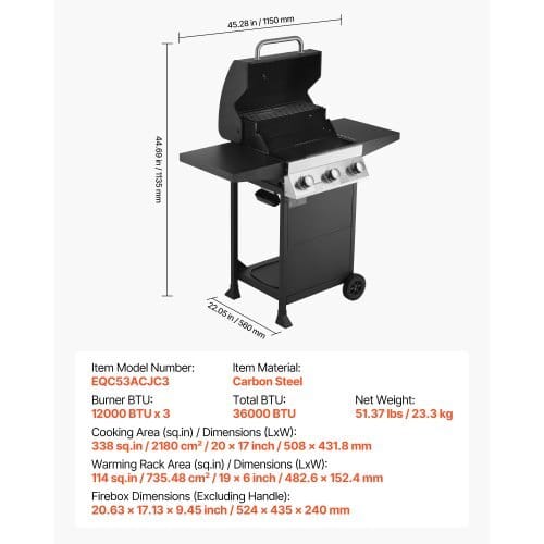 Item Dimensions (LxWxH): 45.28 x 22.05 x 44.69 inch / 1150 x 560 x1135 mm,Item Material: Carbon Steel,Total BTU: 36000 BTU,WarmingRack Area (sq.in) / Dimensions (LxW): 114 sq.in / 735.48 cm², 19 x6 inch / 482.6 x 152.4 mm,Burner BTU: 12000 BTU x 3,Item ModelNumber: EQC53ACJC3,Firebox Dimensions (Excluding Handle): 20.63 x17.13 x 9.45 inch / 524 x 435 x 240 mm,Net Weight: 51.37 lbs / 23.3kg,Cooking Area (sq.in) / Dimensions (LxW): 338 sq.in / 2180 cm²,20 x 17 inch / 508 x 431.8 mm